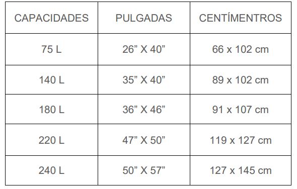 Hay cinco capacidades diferentes, desde 75 L hasta 240 L, y cada una tiene su correspondiente medida en pulgadas y centímetros.