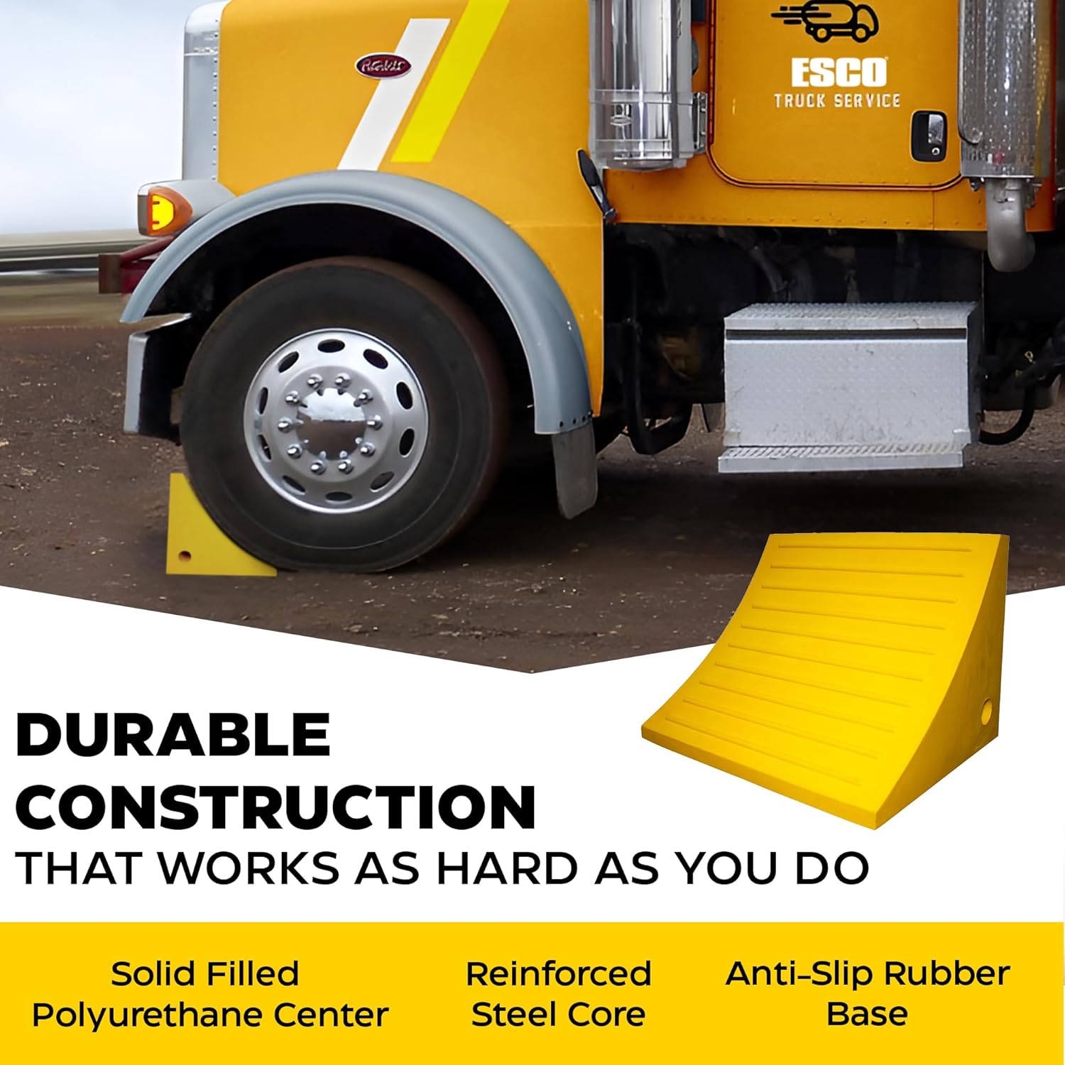 Tacos fabricados con poliuretano de alta resistencia en color amarillo brillante y diseñados para ruedas de vehículos pesados con capacidades de carga de 60 a 80 toneladas. La superficie texturada tipo diamante ofrece un mejor agarre del neumático, mientras que la adherencia del taco al neumático y su resistencia a productos químicos y aceite lo hacen altamente resistente y duradero. Cada taco tiene una perforación para cuerdas, cadenas o soporte de montaje y puede soportar hasta 80 toneladas de peso. Estos tacos son una solución ideal para mejorar la tracción y la seguridad en vehículos pesados en superficies difíciles.